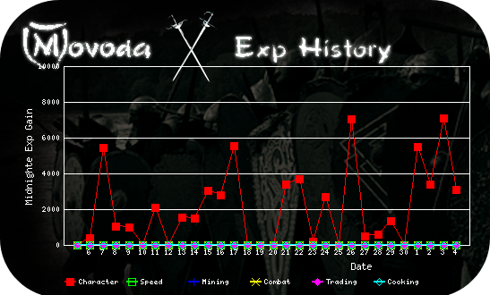 MidnighteMember Since: 2009-09-25 05:02:34 Active playing time: 1078 Days, 22 Hours, 27 Minutes Member Number: 0000011555 Character Experience: 42,458,985 Character Level: 80 Highest Skill: Harvesting Level 78 Nationality: Odtoni Guild: Redemption Guild Position: Leader |